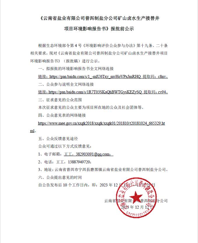 亚娱平台客服普洱制盐分公司矿山卤水生产接替井项目环境影响评价第一次公示 2023-06-08 more