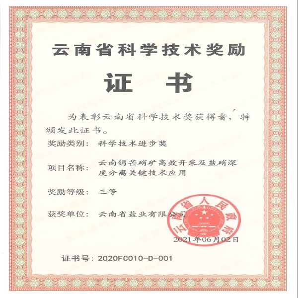 研发中心 报道 2021年11月18日,公司“云南钙芒硝矿高效开采及盐硝深度分离关键技术应用”成果喜获云南省2020年度科学技术进步奖三等奖。