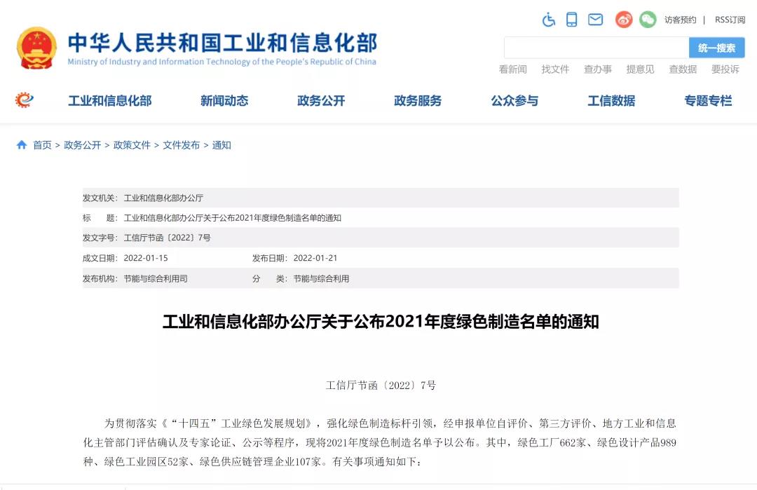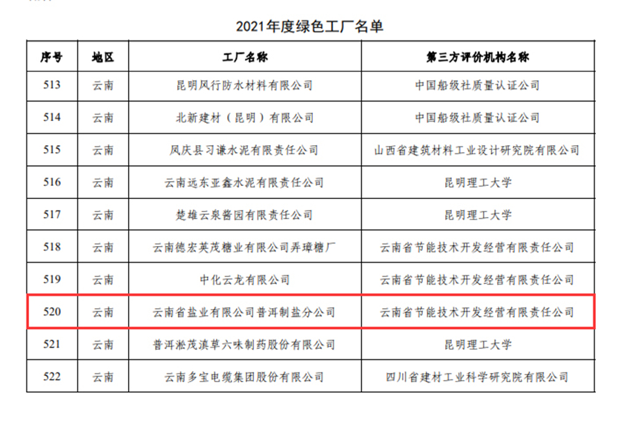 日前,国家工信部公布了全国2021年度绿色制造名单,能投股份所属亚娱平台客服普洱制盐分公司荣获“国家绿色工厂”称号。