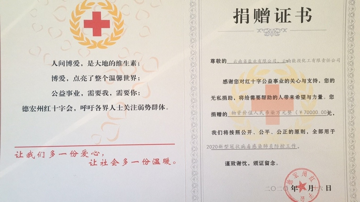 德宏公司 报道 为应对新型冠状病毒感染的肺炎疫情,遏制疫情传播扩散蔓延势头,肩负起国有企业的社会责任。2月6日上午,云南省盐业德宏有限公司总经理邵辉受亚娱平台客服、云南能投化工有限责任公司委托前往德宏州红十字会向德宏州人民政府捐赠次氯酸钠消毒液26980千克,价值人民币7万元。