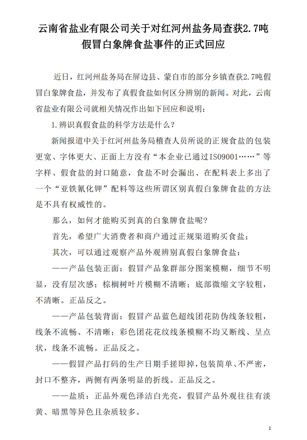 近日,红河州盐务局在屏边县,蒙自市的部分乡镇查获2.7吨假冒白象牌食盐,并发布了真假食盐如何区分鉴别的新闻……