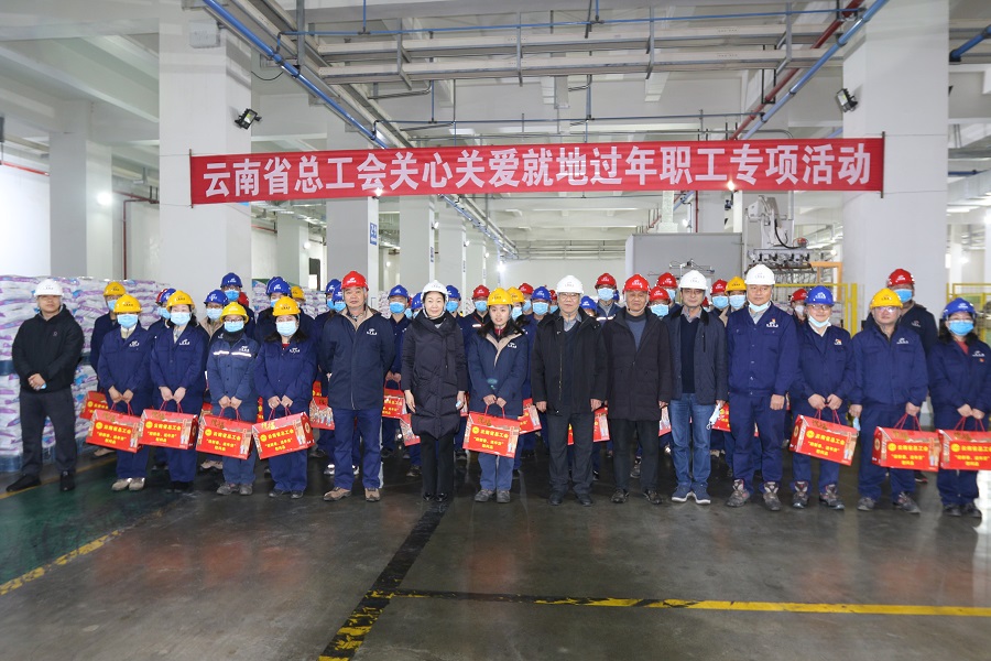 昆明盐矿 报道 2月9日,云南省总工会党组成员、经审会主任张松、法律和维权工作部部长张泽平、经审办一级主任科员耿望博一行到云南盐业所属昆明盐矿开展关心关爱就地过年职工专项活动,向为了生产和疫情防控不能回家过年的一线职工送去温暖和关怀。能投集团党委副书记江萍、工会副主席张梅陪同慰问。